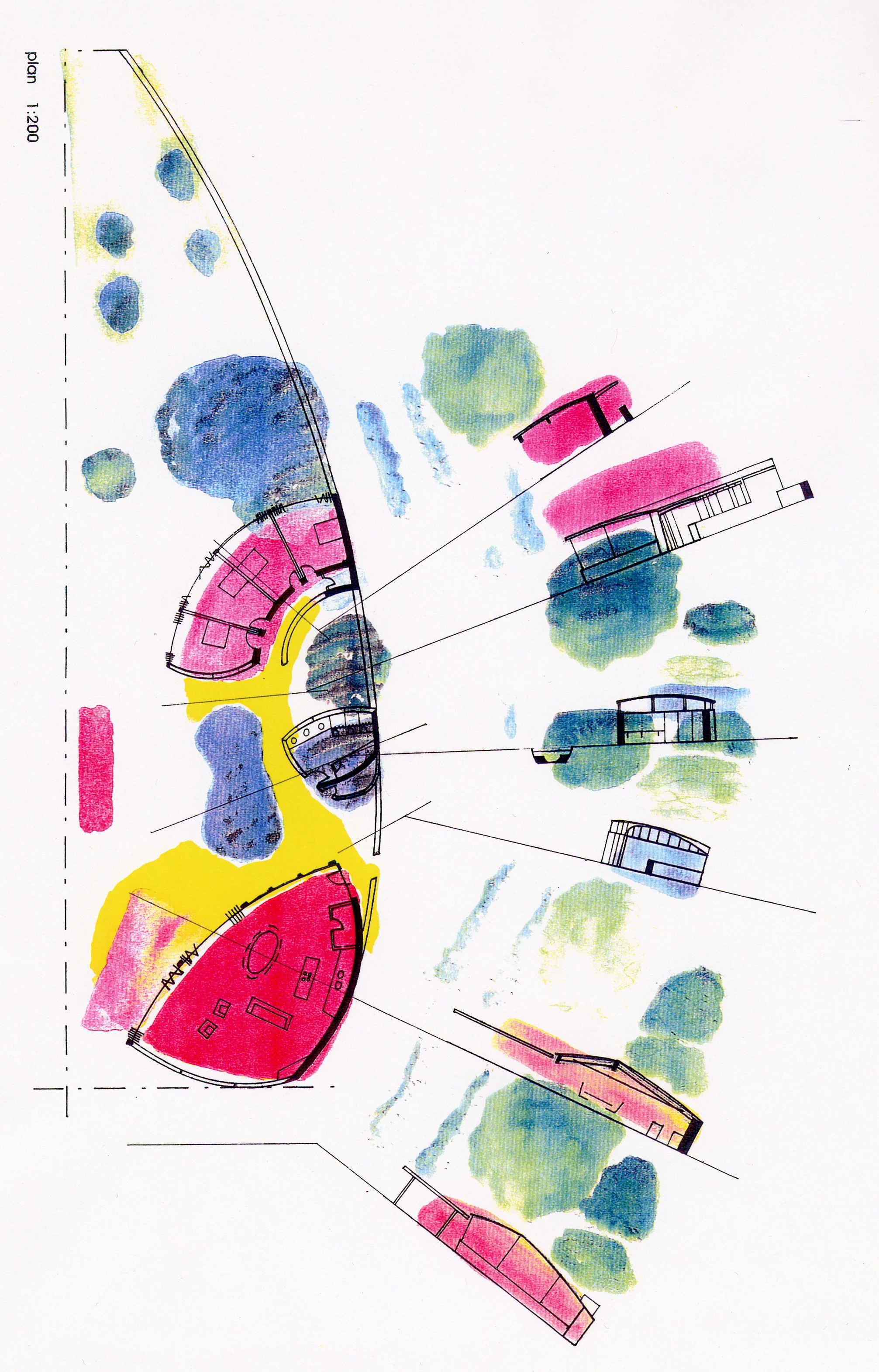 The topographic sketch model revealed some difficult choices. The cliffs overlooking the sea were an opportunity for dramatic architecture, but at the cost of substantial impact to the coast. The natural harbor and pier inhabited by a local fishing village lent themselves to more traditional high-rise, beachfront development; however, this model when implemented elsewhere has tended to push aside existing inhabitants in favor of foreign investors and tourists, with little of the money or jobs benefitting the domestic economy and at considerable harm to the local environment. Portions of the group split off to pursue variations on those models. The two of us who remained chose to pursue a truly low impact development plan with a goal of realizing as much benefit for the Bulgarians as possible. The choice was to add to and further develop what had been started at the harbor overlooked by the existing fishing village.