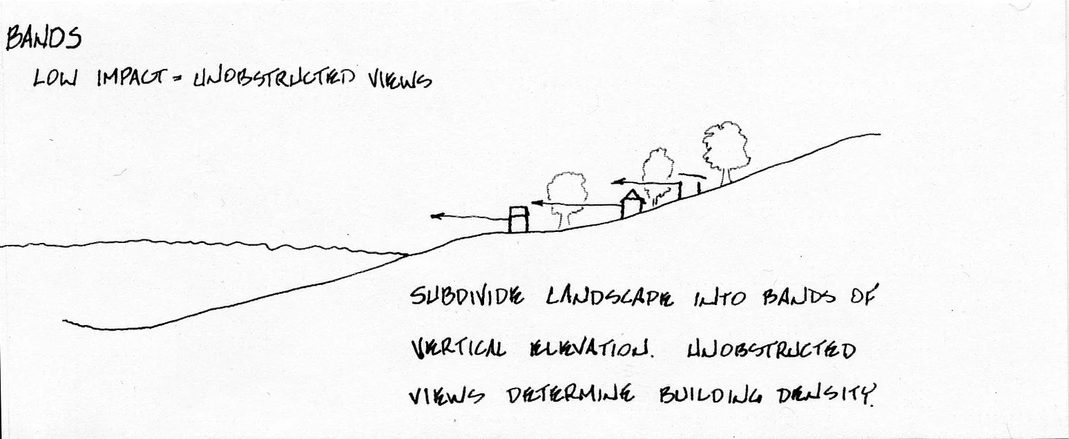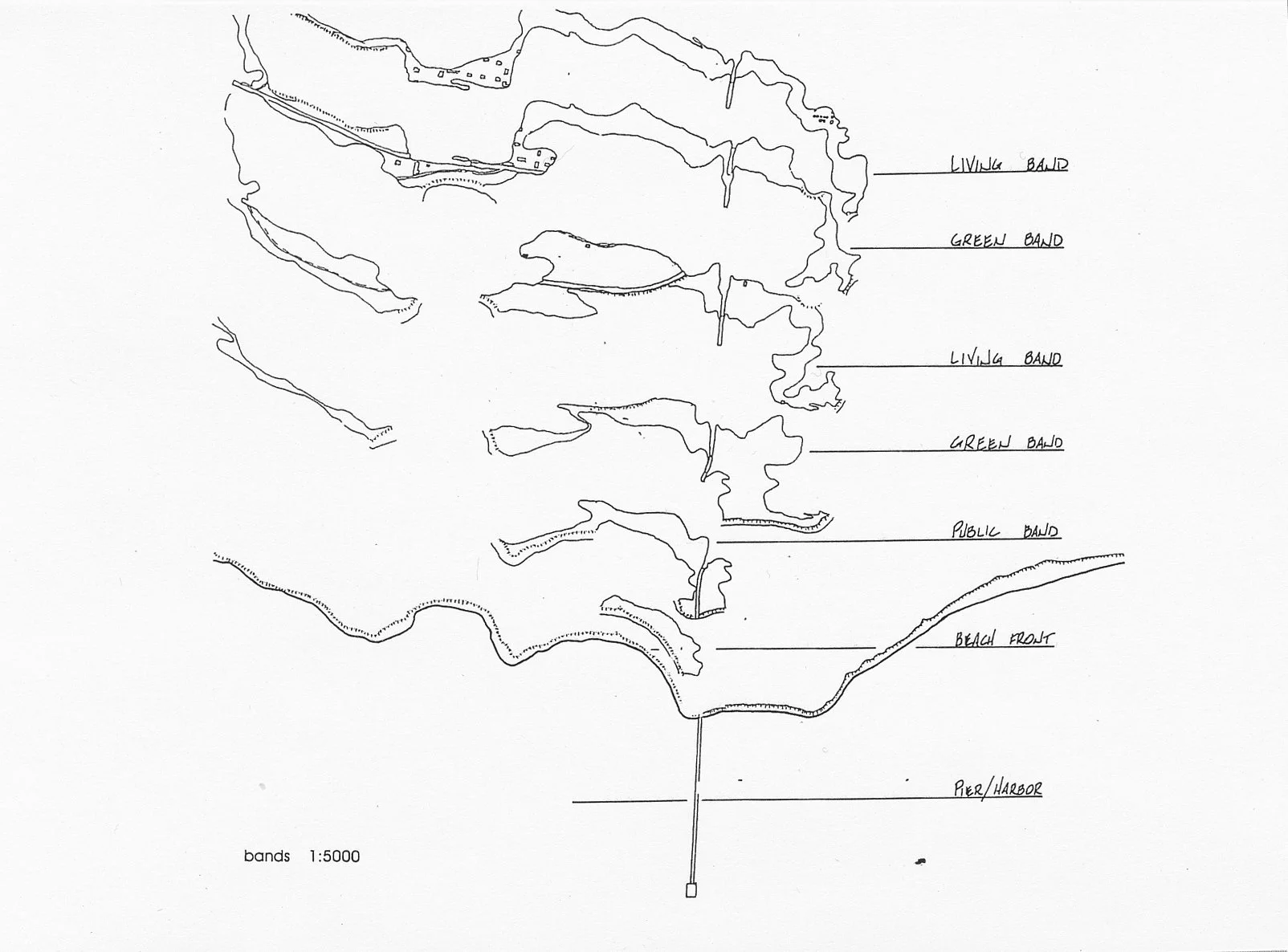 A study of the topography showed that it would be possible to subdivide the harbor area into bands of fields/parcels moving out from the harbor separated far enough vertically to preserve views to the sea from each parcel between bands of green space to limit density and impact to the environment. The beach front, pier and immediately surrounding area were designated for public uses such as leasing offices, restaurants, cafe’s, grocers, sundries, clothing, etc. A system of paths and ways was developed acknowledging the bands, buffer areas for privacy, and following the topography lines guiding the overall development. The intent was to facilitate pedestrian traffic, while severely limiting auto traffic to arrivals and departures at the beginning and end of each rental period.